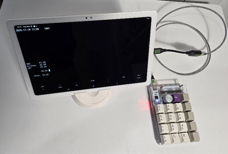 This reminded me of a macropad that I had built, a Nullbits Tidbit. I could connect the macropad to a tablet running an application that would interpret the user input, display relevant information, and record everything to a file. I had Termux installed on my tablet, providing a Linux environment that I could develop in. I’ve created applications in Bash, Awk, and Gforth, so I had some tools that I was familiar with.